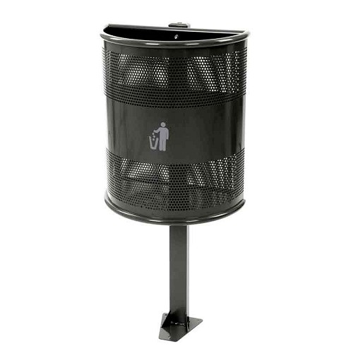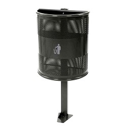 Halfronde, gedeeltelijk geperforeerde afvalbak van metaal op paal. De bak kan geleegd worden door het losdraaien van de sluitschroef, de bak is dan zijwaarts kantelbaar. Kleur : grafiet Formaat : B 500mm L 250mm H 840mm