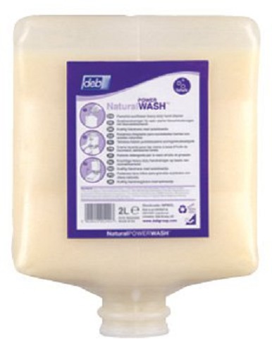 Deb® Natural POWER WASH - Zeer krachtige handreiniger met natuurlijke olijfkorrel en maïsmeelkorrel die zonder problemen olie,vet,smeer en andere industriële vervuilingen verwijdert. Verpakt per doos à 4 x 2 liter.