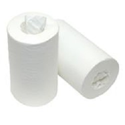 Mini rollen cellulose zonder koker in doos à 12 rollen. 120 meter per rol, 22 cm breed, 1 laags.
