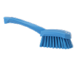 Vikan korte afwasborstel met harde vezels in ergonomisch en praktisch design.Voor dagelijkse reiniging in industrie, detailhandel en horeca. Afwasborstel met korte steel. Polyester vezel, Hard. 270x70x85mm. Kleur blauw.